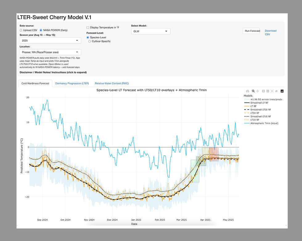 A phenology forecasting tool that integrates dormancy progression, cold hardiness modeling, relative water content dynamics, and environmental data to estimate developmental state and freeze risk in sweet cherry. The application provides interactive time-series visualizations to help growers, researchers, and industry professionals interpret seasonal bud development and potential freeze risk.